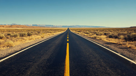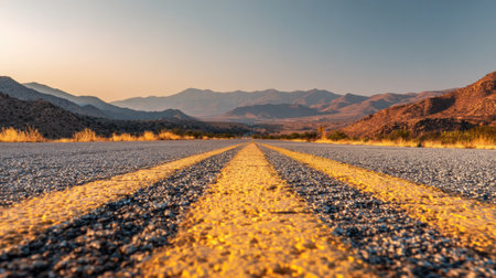 Low-angle perspective captures a straight desert highway receding towards distant mountains under a clear, pale blue sky, highlighting the yellow road markings.