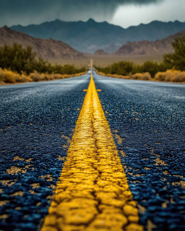 A long road stretches toward distant mountains under a cloudy sky. The road is asphalt, marked by a bright yellow dividing line. The composition features leading lines and a low-angle perspective. Suitable for commercial or editorial applications, the image evokes a sense of journey and destination in an outdoor setting.