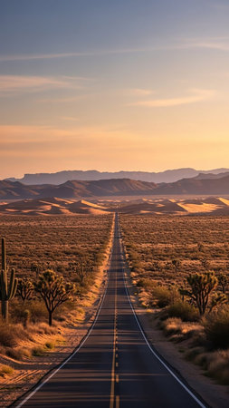 Beauty showing endless desert highway stretching towards distant mountains under a warm sunset sky with joshua trees and cacti keywords: desert highway, road,...