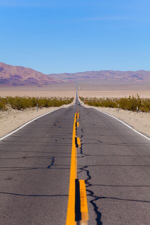 Straight cracked road with lines during day time in desert, California, United States