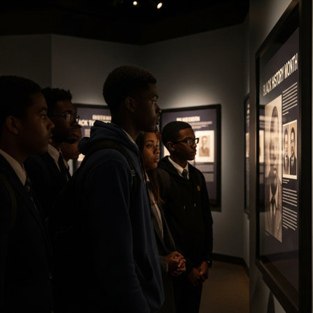 Diverse elementary school children captivated by a Civil Rights history exhibit in a museum. Cinemat