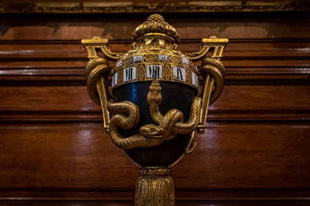BUENOS AIRES, ARGENTINA, JANUARY 30, 2021: Old french bronze urn shaped clock with snakes pointing time at the Museum of Decorative Art