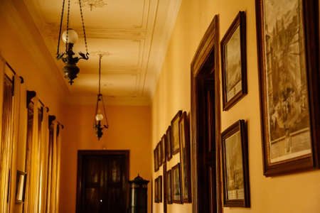 Libochovice, Bohemia, Czech Republic, 19 September 2021: Castle interior with baroque wooden carved furniture, corridor with paintings and engravings on the walls, forged lamps, ceramic tiled stove