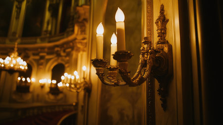 This captivating image showcases elegant vintage candlestick holders, casting a warm glow against a luxurious theater interior, enhancing the rich atmosphere.
