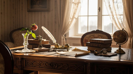 A richly detailed vintage writing desk is bathed in warm sunlight streaming through a large window. On the desk, a delicate rose in a glass vase sits beside a quill pen and inkwell, surrounded by stacked books and an antique globe. The ornate wooden desk intricate carvings, and the scene is completed by plush upholstered chairs and flowing curtains, evoking a sense of timeless elegance and scholarly pursuit.