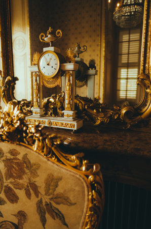 rich apartment interior with golden baroque decorations on the walls and luxury furniture. the room is flooded with the rays of the setting sun