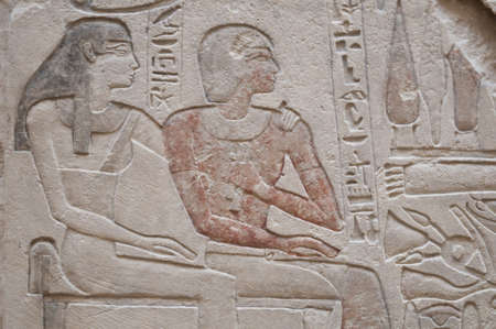 Cairo, Egypt - November 02, 2021: Interesting Ancient Paintings and Engravings with Hieroglyphics symbols in the Cairo Egyptian Museum, the oldest archaeological museum in the Middle East