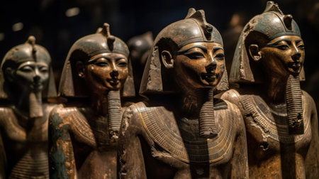 A row of statues of Egyptian pharaohs are lined up on a background. The statues are all different sizes and colors, but they all have the same design and pose