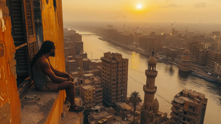 Aerial view of a woman sitting on a balcony at sunset in Cairo, Egypt