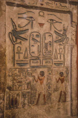 Ancient Egyptian art of hieroglyphs carving on stone. Tomb in the Valley of the Kings in Luxor