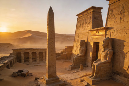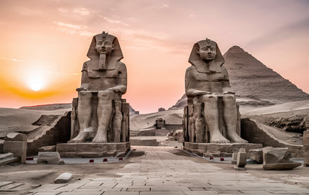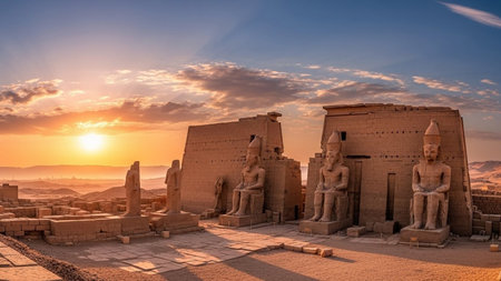 Ancient Egyptian Temple Ruins at Sunset with Colossal Statues