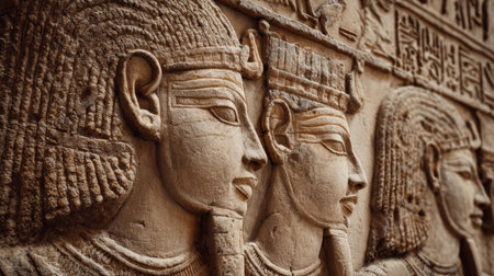 Ancient Egyptian stone carving of three profile faces with detailed headdresses and hieroglyphics, showcasing historical art and culture