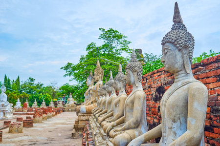 The row of Buddha statues in Wat Yai Chai Mongkhon Temple, Ayutthaya, Thailand