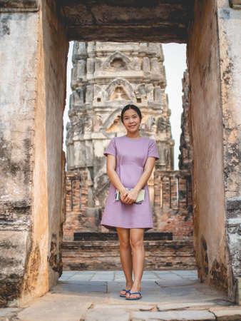 Woman wearing purple dress and old temple at Sukhothai, Thailand