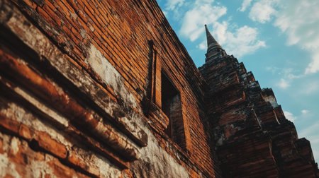 Low-angle perspective shot of Thapae Gateaes red brick wall, showcasing the texture and enduring strength of this historic site.