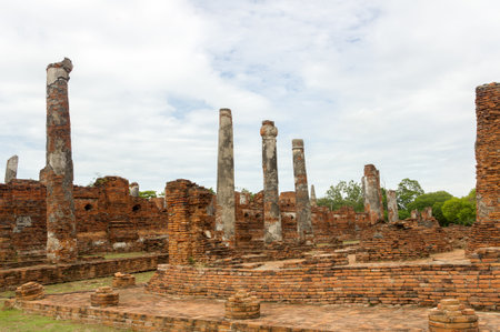 Ancient ruins of Ayutthaya Historical Park in Thailand. No people, copy space.