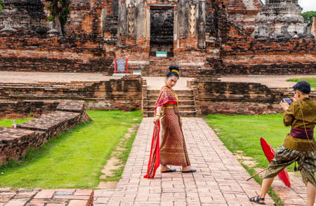 Thai women portrait at ancient building at Wat Mahathat in Ayutthaya, Thailand