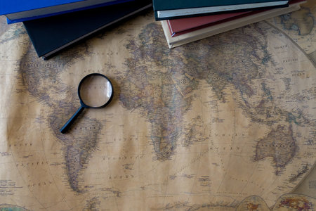 Stack of books on a wooden desk with a pastel ivory background, with a small globe, travel, study