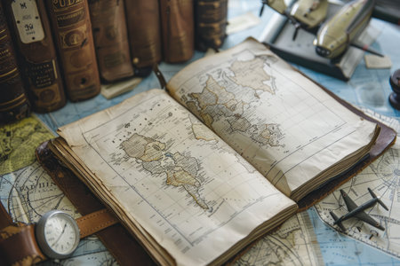 Aviation Adventure: Detailed Flight Planning in Worn Leather Logbook with Miniature Airplanes and Navigational Charts