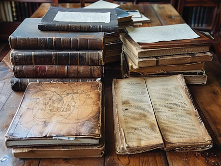 A collection of ancient books, scrolls, and artifacts lies scattered on a rustic table, revealing the rich history captured within.