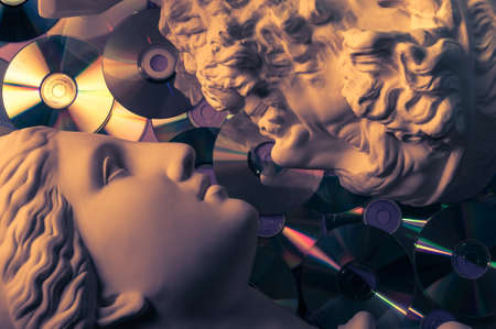 Antique statues of woman and man heads close up on a glitter CDs background. Concept of music, style, vintage, love.