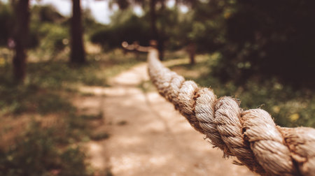 A thick, textured rope extends along a dirt pathway surrounded by trees and greenery on a sunny day, inviting exploration in nature.