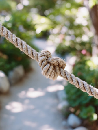 A sturdy rope knot holds firm on a pathway, bordered by lush plants and flowers, creating a peaceful ambiance in a garden space under sunlight.