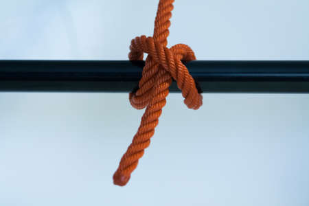 Guard rail with tied ropes on it. Close-up of a metal pipe with a natural rope. Marine theme. Monochrome