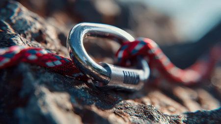 Close-up of a carabiner attached to a rope on rocky surface, symbolizing safety, adventure, and mountain climbing.