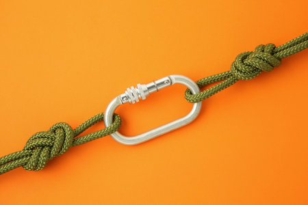 One metal carabiner with ropes on orange background, top view