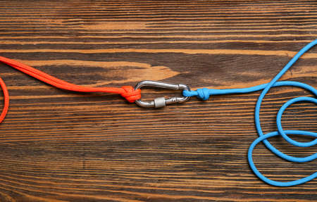 Ropes with lobster clasp on wooden background