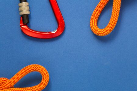 Blue carabiner and a climbing rope, Equipment for belaying in climbing and mountaineering.