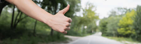 partial view of hitchhiker with thumb up stopping car on countryside road, banner