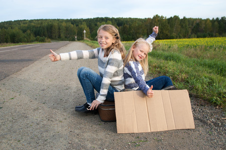girlfriends on the road hitchhiking with sign