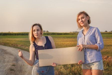 Two beautiful girls get hitchhiked and vote with a sign on cars on a rural road in the rays of sunset. Tinted. Copy space. Portrait