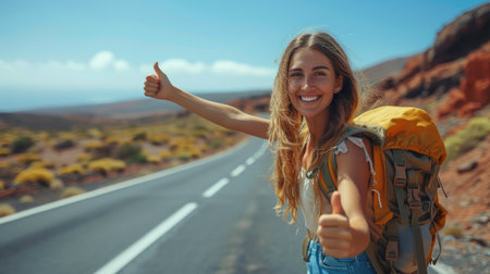 Woman with Backpack Thumbs Up on Empty Road in Tenerife