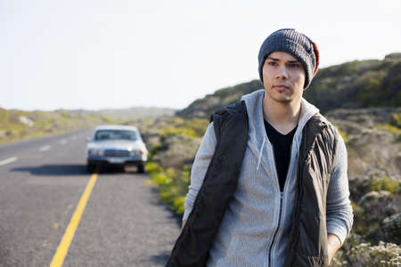 Hitchhiking young traveler man try to catch car on a road.