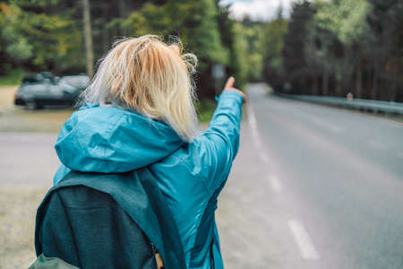 women is hailing a car on a road. Thumbing a ride. Outdoors vacation