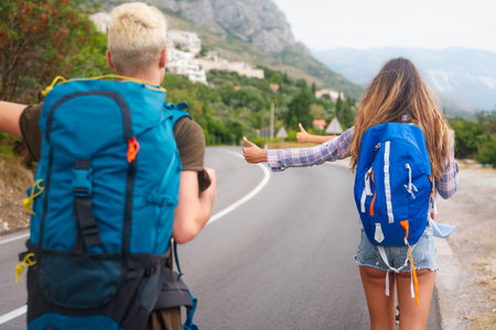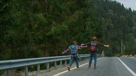 Young couple hitchhikers with backpacks, stands by mountain country road. Couple went on trip alone, trying to stop passing car. Travel concept.