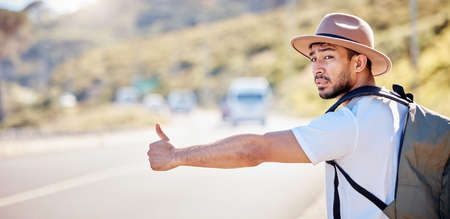 I need to find my way around. Shot of a young man hitchhiking on the side of the road.