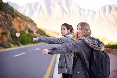 Waiting for a lift. A cropped view of two young woman hitchhiking along a mountainside road.