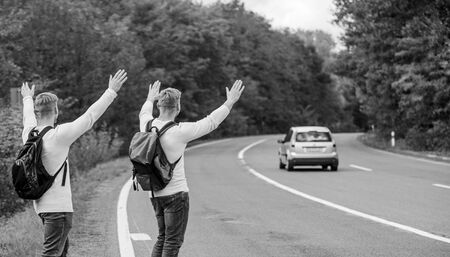 Just friends and road ahead. feel the freedom. Travelling with friends. Travel by autostop. Hopeless hitchhiker. Men try stop car. twins walking along road. hiker man on road. Way of travelling.