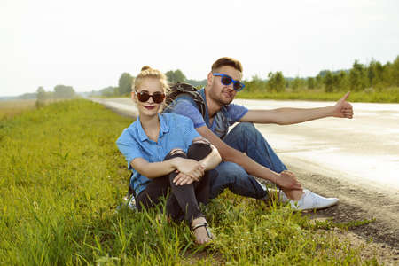 A man and a woman are hitchhiking. A young couple goes hitchhiking around the country. Free hitchhiking trip. A lover who travels free by hitchhiking. The couple goes traveling. Couple by the road