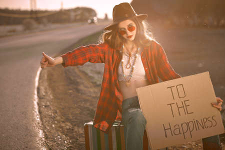 Happiness concept. Pretty hippie girl hitchhiking on a highway. She is looking for happiness. The spirit of freedom and adventures.