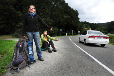 WANAK, NZ - MARCH 02: Young couple Hitchhiking in south island of New Zealand on March 02 2009. New Zealand is one of the safest places in the world to hitchhike.
