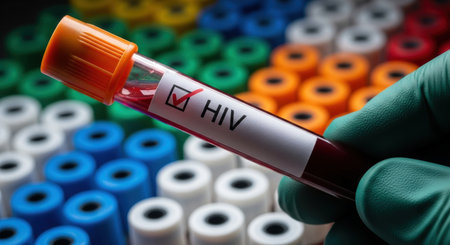 A gloved hand holds a blood sample tube labeled HIV with a checkmark, indicating a positive test result. Rows of other colorful medical tubes are blurred in the background, suggesting a laboratory setting for disease testing and diagnosis.