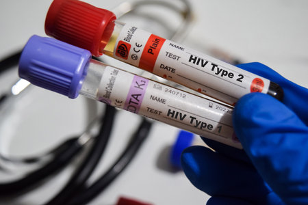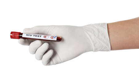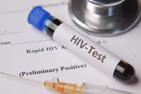 Sample blood collection tube with HIV test label on HIV infection screening test form.