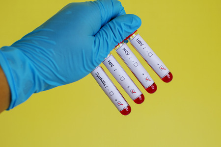 Hiv and aids infection test, hand holding tube with blood on the blue background. Studio shoot.
