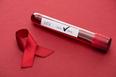 red awareness aids ribbon and negative hiv blood sample test on red background