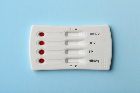 Hepatitis B Virus Surface Antigen Test Kit with positive result on blue background. Screening for hepatitis B uses a blood sample, collected from a finger prick. World hepatitis day.